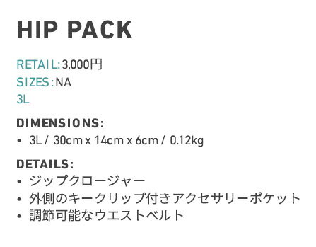 【仕様】 ジップクロージャー 外側のキークリップ付きアクセサリーポケット 調節可能なウエストベルト 慨寸:30cm x 14cm x 6cm 容量:約3L 【保証又はアフターサービスを受けるには】 お買い上げになった販売店に製品と保証書 (当店の場合はお買い上げ明細書も必要です。