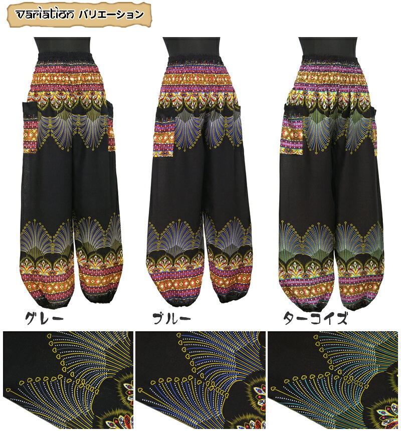 アイテムインフォ カラフルな色合いのピーコック柄がエスニックテイストたっぷりなアラジンパンツです。