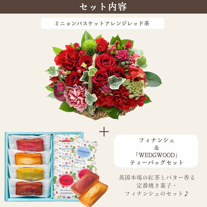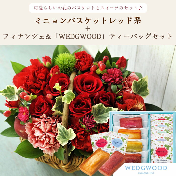 花とスイーツのセット ミニョンバスケット【レッド】+フィナンシェ&【ウェッジウッド】ティーバッグセット WEDGWOOD 送料無料 あす楽 誕生日 記念日 お祝い スイーツ セット バスケット アレンジ 誕生花 還暦 FKAASW