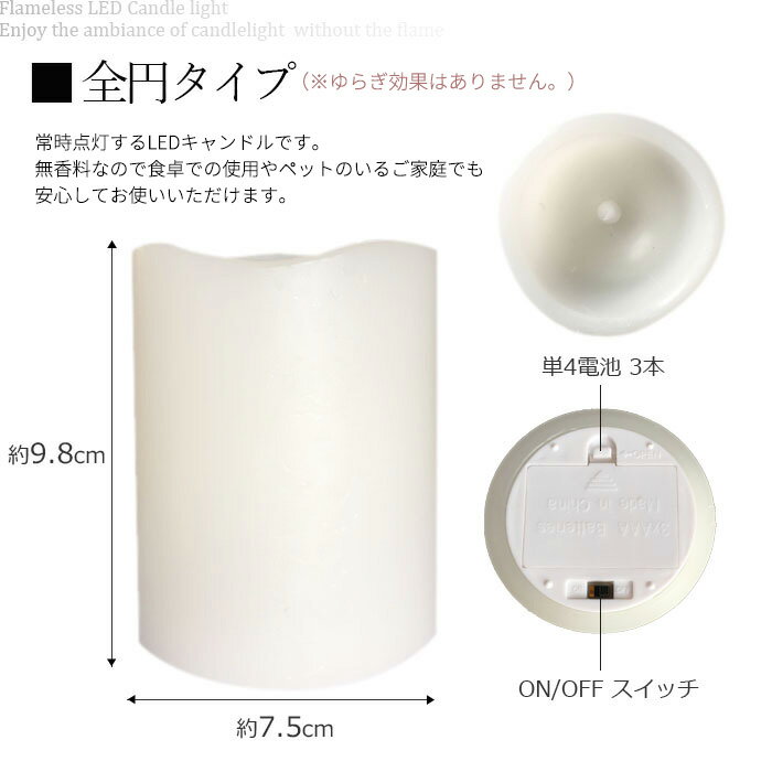 セット内容 LEDキャンドル Lサイズ1本 使用電池:単4電池3本 サイズ ■全円タイプ 高さ:約 9.8cm×直径 約 7.5cm■半円タイプ 高さ:約 9.2cm×直径 約 7.5cm 材質 キャンドル本体筐体:本物の蝋 LED発光部:プラスチック 半円タイプの芯部分:プラスチック 使用時のご注意 ●本製品は柔らかく変形しやすい為、強い衝撃を与えないようにしてください。