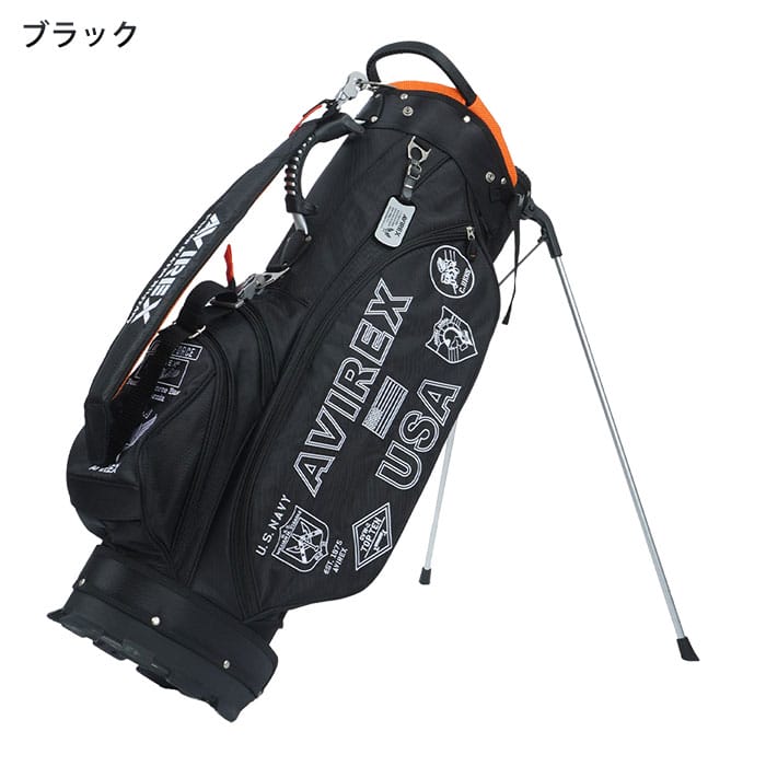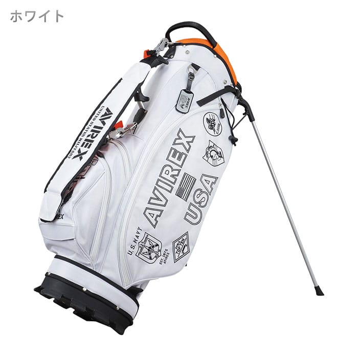 型番 AVXBB1-27C サイズ 9型 口枠 本体:5分割 セルフスタンド:3分割 重量 約3.3kg 素材 ポリウレタン、合成皮革 原産国 中国セルフスタンドケース付き キャディバッグ アビレックスブランドの定番ロゴやモチーフを配したスタンドキャディバッグです。