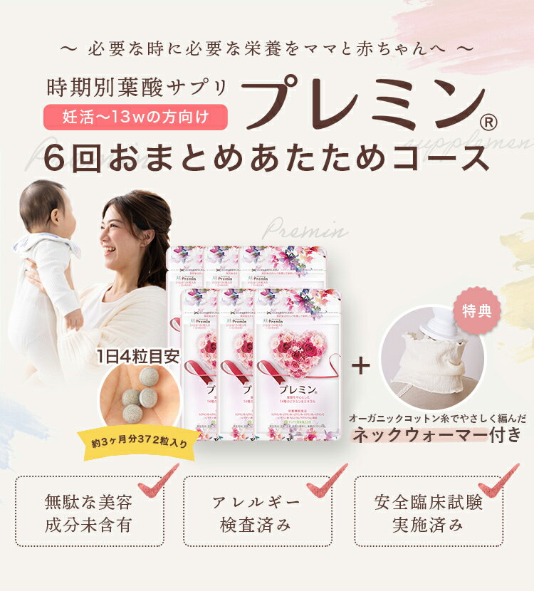 【67週連続1位継続中】特典付き 時期別葉酸サプリ プレミンおまとめコース約6ヶ月分 124粒入り×6セット (妊活中から13週向け) 葉酸サプリ ゲンナイ製薬 妊活サプリ 妊娠 ビタミン 送料無料 アレルギー検査済み 安心安全マーク取得