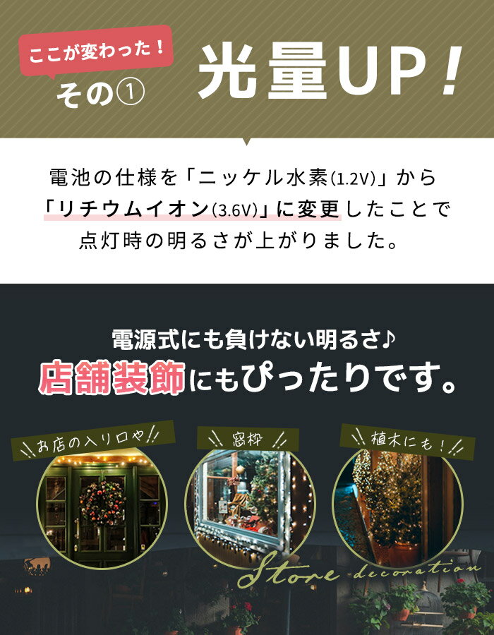[ここが変わった] (1)光量UP! 内蔵バッテリーをニッケル水素充電池からリチウムイオン充電池に変更したことで点灯時の明るさがアップ。