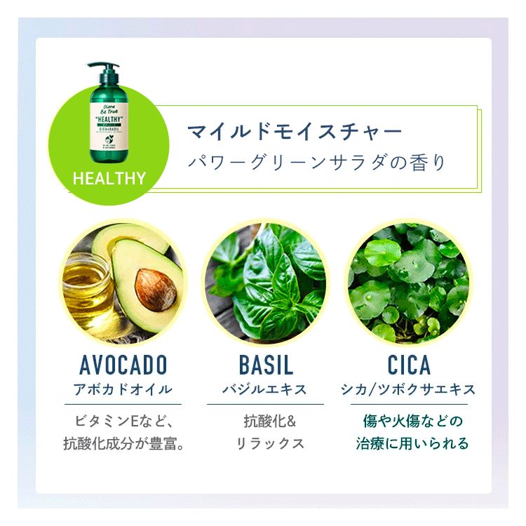 ●シカ×バジル(*4)×アボカドオイル(*3) 使用 ●無添加:シリコンフリー・エタノールフリー・パラベンフリー・合成色素フリー・サルフェートフリー (ラウレス硫酸Naなど)・鉱物油フリー *1 水を含む *2 パイナップル果実エキス、グルコシルセラミド(全て保湿成分) *3 アボカド油 *4 カミメボウキ葉エキス ※パッケージデザイン等は予告なく変更されることがあります。
